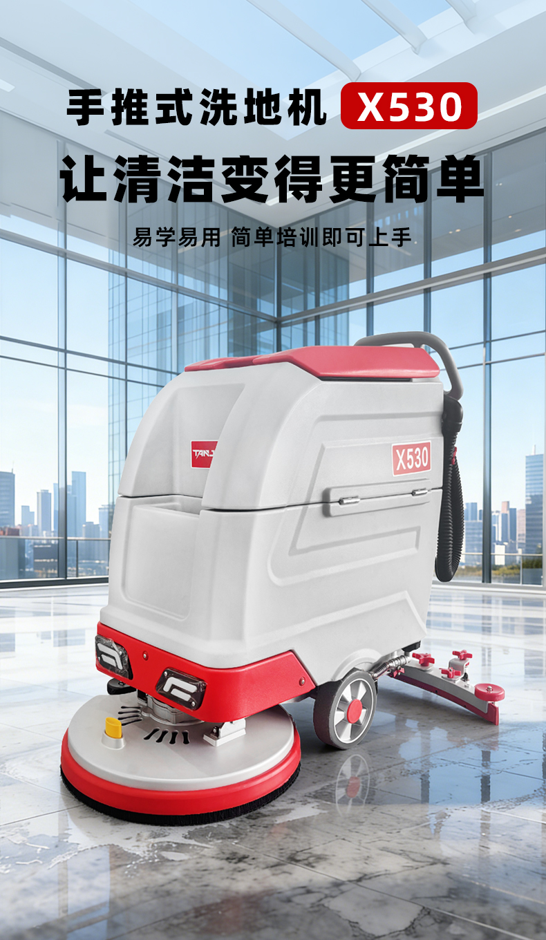 产品简介:利之星手推式洗地机X500整机设计美观大气,操作简单易上手,一台机器可代替5-6人,适用于物业、医院、工厂、仓库、机场、车库等小面积室内场景地面清洁作业。